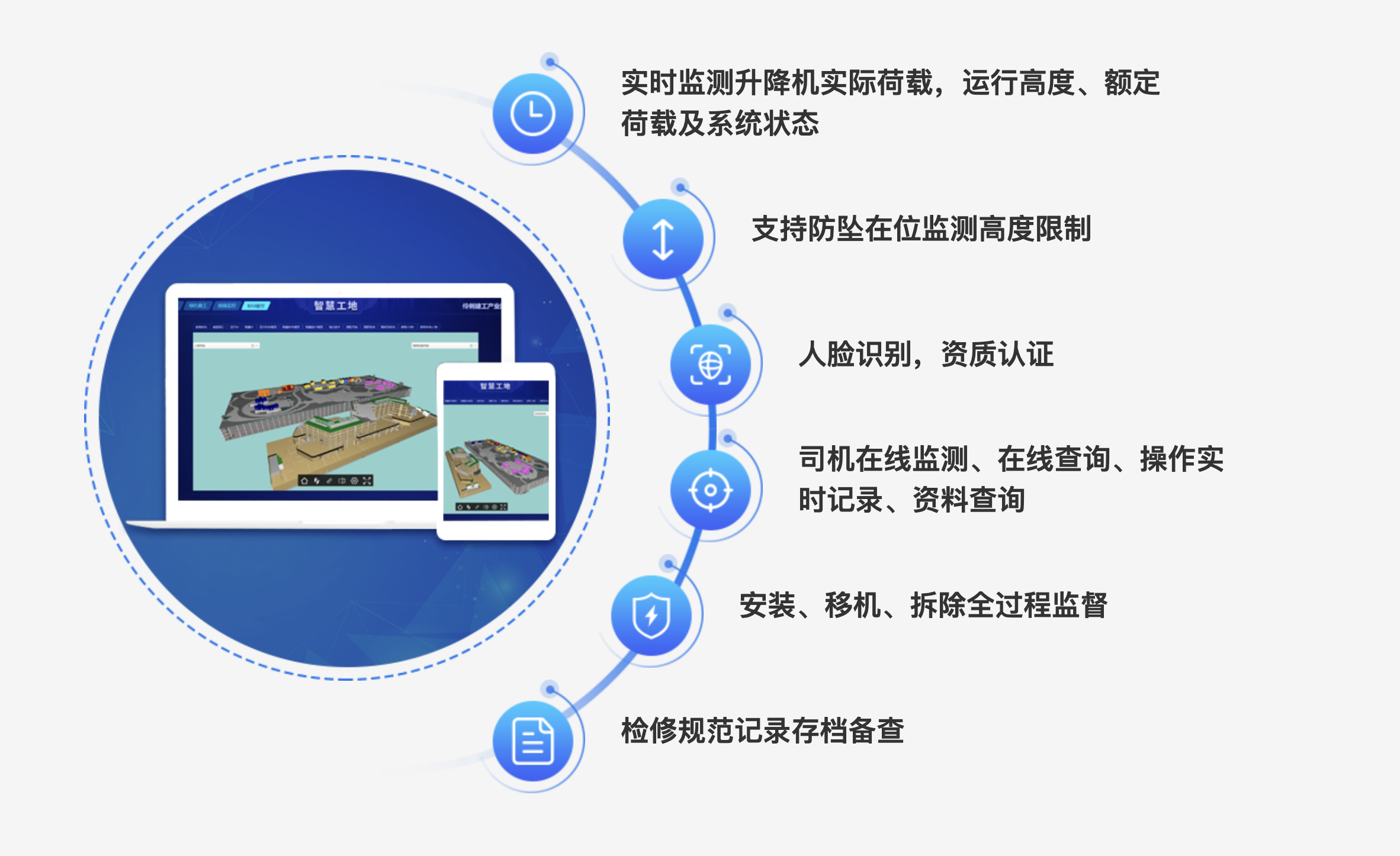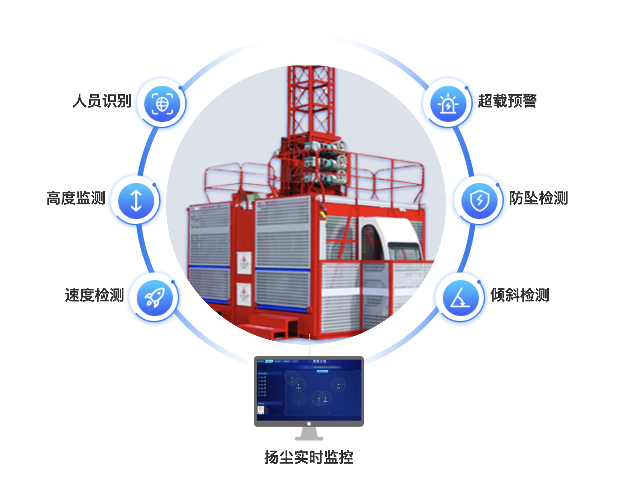 施工升降机安全监测的研究现状及其发展趋势,明确了升降机安全监控系统所要达到的性能指标。根据施工升降机安全 监控系统的功能需求,集成载重监测、人数监测、速度监测、倾斜度监测、高度限位监测、防冲顶监测、电压监测、门 锁状态监测,驾驶员身份识别等功能。提供超标异常报警体系,远程监控体系,实现升降机的全方位安全监管能够全方 位实时监测施工升降机的运行工况,达到监管升降机施工安全的目的。