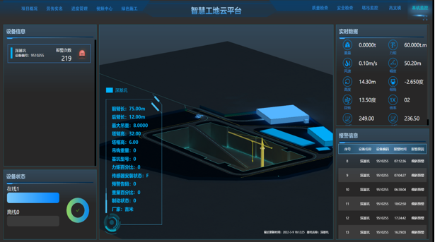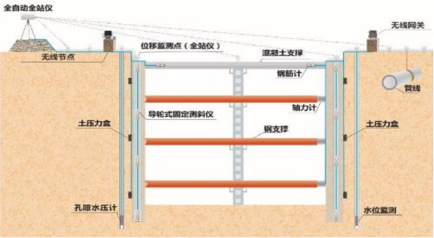 深基坑监测主要对支撑应力变化、基坑位移、地下水位变化、建筑物沉降倾斜进行监测,当出现危险时,及时发布预警消息。